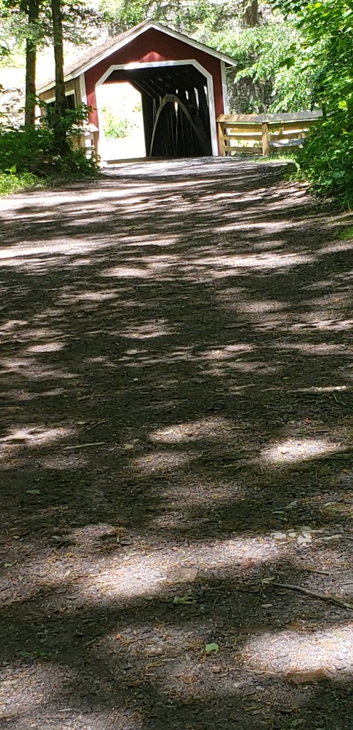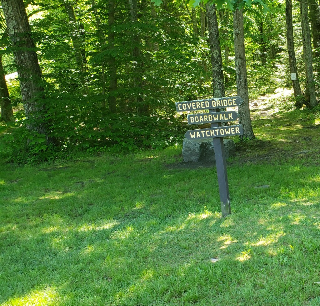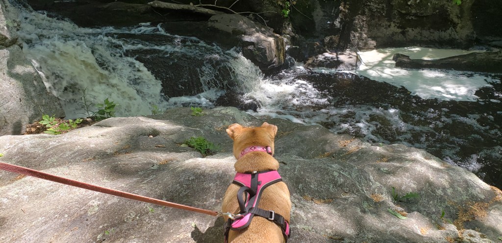 After watching the water a bit, I took my humans down a trail, which led to this covered bridge! I’m not normally a fan of bridges but I strutted across this like the champ that I am. On the other side, the trail splits two different ways. You could either go straight, or you could turn left, which would loop you back to the top of the falls (which aren’t very high). Because it was a warm day, I was having trouble breathing, so my human took the left, and Frankie came with us, but her brother went straight. After he came back, he and his mother wanted to find the watchtower, but I was all for chilling under the picnic table. My human stayed behind with me and her father, while the other two took Frankie. Good thing I didn’t go! Apparently, there’s a pretty good hill to go up, which would have been too much for me. Then they got lost! The trails weren’t clearly marked near the top. They never made it to the watchtower, as they hit a couple of dead-ends. They had to pick up Frankie a couple of times, especially over a branch that had come down but was too high for him to make it over.