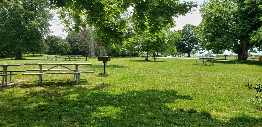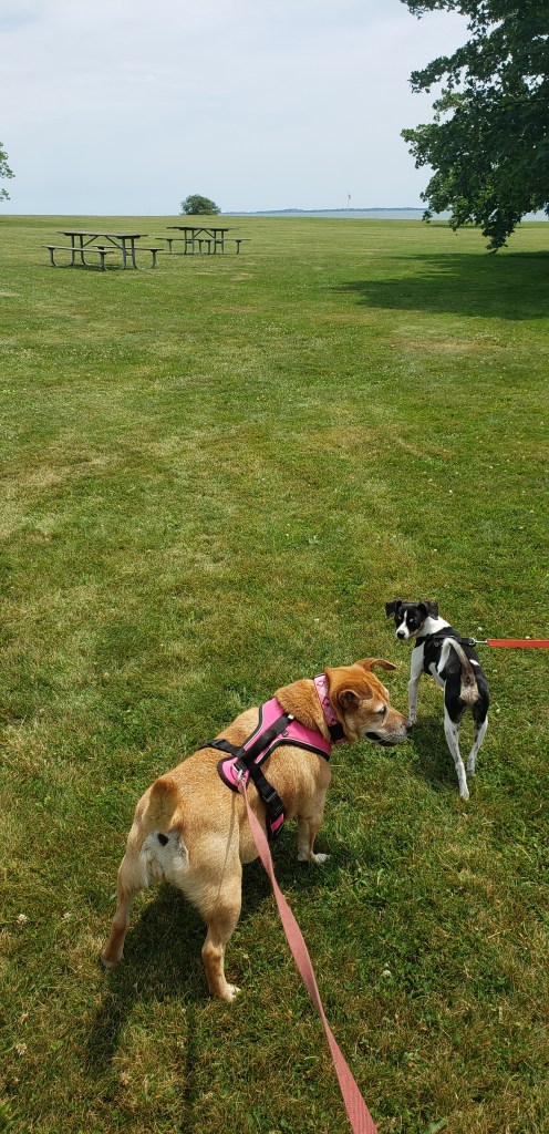 After parking, we went walking! There is a large area with plenty of picnic tables. We didn’t have a picnic, but there were plenty of people who were, and there were still lots of picnic tables available. Walking around the path, there’s a section with a water view and some seats. My human said they probably use it for weddings. Slightly past there is an entrance to the beach. Dogs are not allowed on the beach from April to September due to nesting birds. Swimming also is not allowed, but you can wade in the water.
